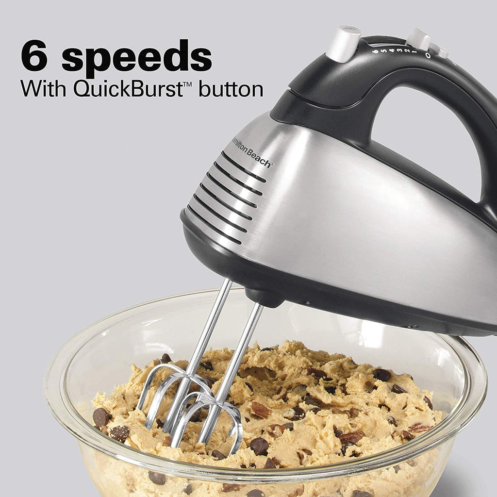 Hamilton Beach Hand Mixer handles are designed for control and comfort, and the unique Bowl Rest feature allows the mixer to sit on the edge of the bowl to eliminate messy drips. A special QuickBurst button provides a quick boost of power and can be used for tough tasks at any speed.