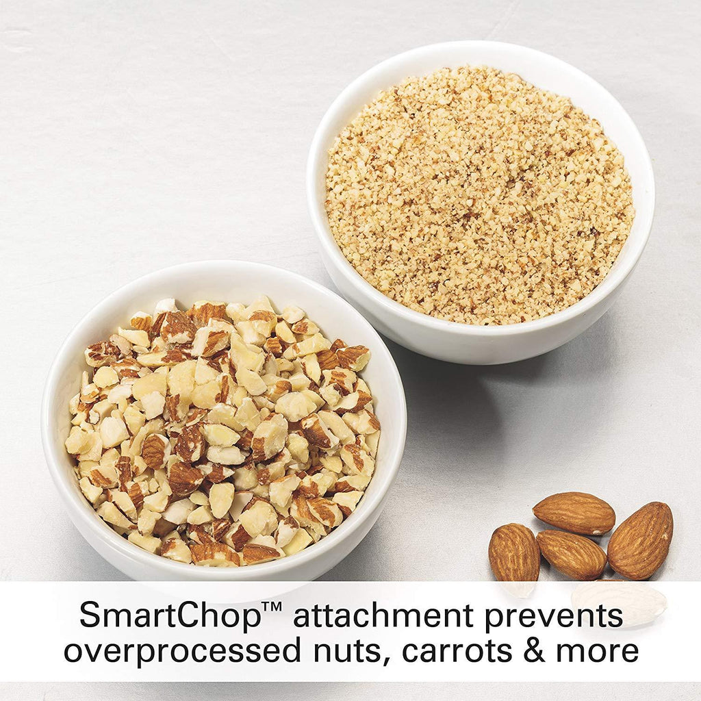 The SmartChop Food Chopper works two ways to produce ingredients of the perfect size and consistency for your recipe. Use the SmartChop attachment to prevent overprocessed nuts, carrots, onions, celery and more, or use it without the attachment for traditional chopping of softer foods, fine chopping and pureeing.